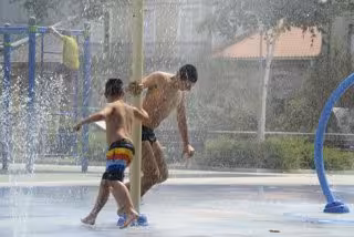 Dos personas se refrescan en unos chorros durante un día de calor en Ourense. - Rosa Veiga - Europa Press