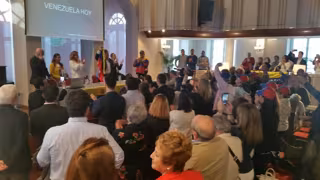 Más de 200 personas, muchas de ellas de pie por falta de espacio, se han juntado para recibirlo entre aplausos y ovaciones durante la presentación. Muchos de los presentes estaban ataviados con los colores de la bandera de Venezuela y portaban carteles con lemas como 'SOS Venezuela' o 'No más represión'.