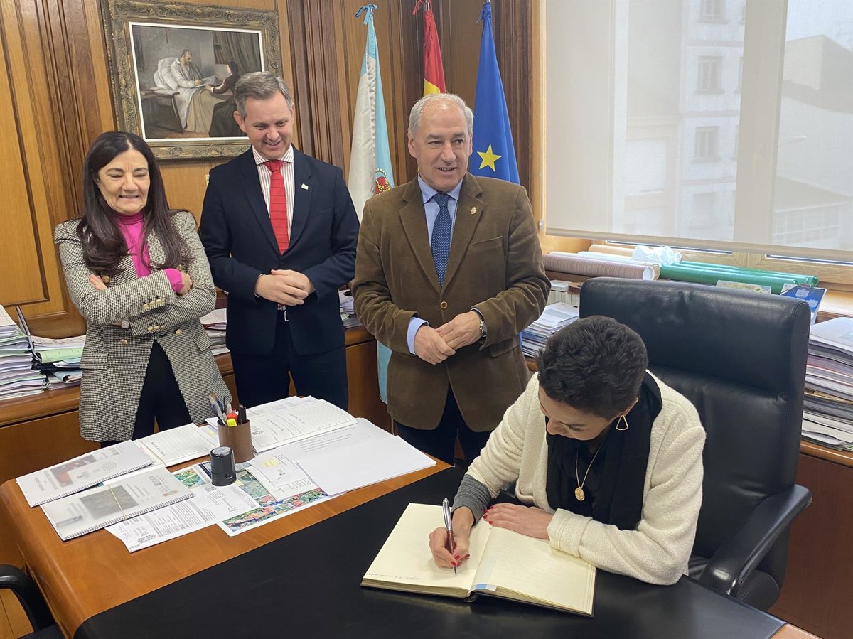 La secretaria de Estado de Transportes, Movilidad y Agenda Urbana, Isabel Pardo de Vera, firma en el libro del Ayuntamiento de Monforte junto al alcalde, José Tomé, y el delegado del Gobierno en Galicia, José Miñones - DELEGACIÓN DEL GOBIERNO