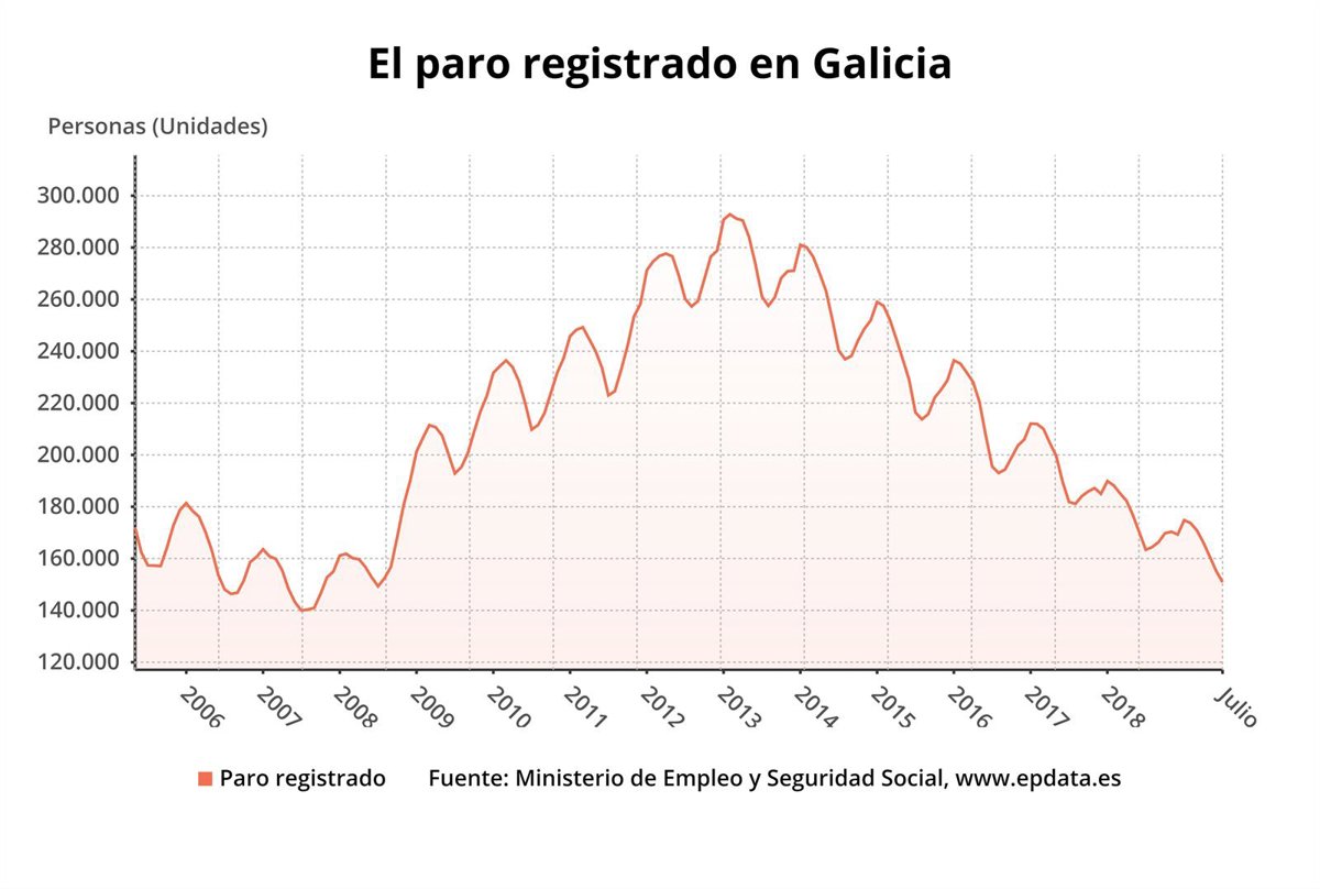 El número de parados registrados en las oficinas de los servicios públicos de empleo (antiguo Inem) bajó en 4.328 personas en julio en Galicia en relación con junio, un 2,79%, casi 20 más que la media (-0,14%). De esta forma, el total se sitúa en 150.921 desempleados.