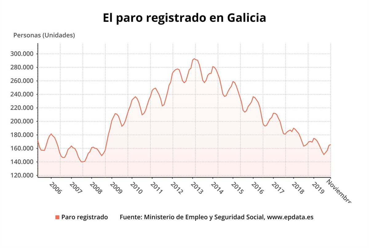 Según los datos que publica este martes el Ministerio de Trabajo, Migraciones y Seguridad Social, el desempleo registrado en la Comunidad gallega en noviembre, que alcanza en total a 165.659 personas, es inferior en 4.710 al del mismo mes de 2018 (-2,76%).