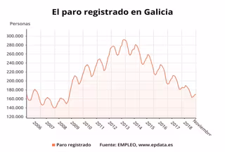 El total de desempleados en Galicia es de 170.369, lo que supone 16.806 personas menos que un año antes, tras bajar un 8,98% en relación a noviembre de 2017.