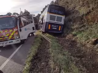 Los pasajeros de un autobús que cubría la ruta Santiago-Noia-Muros tuvieron que salir por la bodega de carga después de que el vehículo en el que viajaban saliese de la vía, a su paso por el municipio coruñés de Lousame, y las puertas quedasen contra un muro.