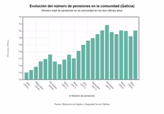 En Galicia, de las 761.063 pensiones 474.075 son por jubilación, con una cuantía media de 904,32 euros; 186.813 corresponden a viudedad con una media de 556,18 euros; 69.939 a incapacidad permanente con 844,48 euros; 23.819 a orfandad con 377,64 euros y 6.417 a favor de familiares con 483,63 euros.