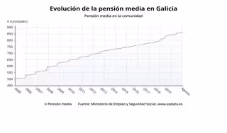 La pensión media en Galicia aumentó, a fecha de 1 de agosto, un 2,28 por ciento en relación al mismo mes del año anterior, aunque sigue a la cola del Estado, con una media de 861,26 euros. Solo Extremadura, con 843,52 euros, computa una prestación media más baja que la Comunidad gallega.