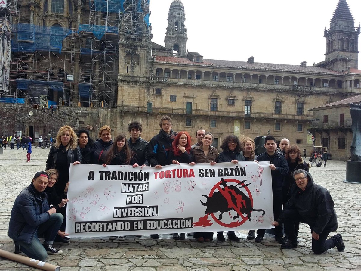 Aproximadamente una veintena de activistas han convocado este domingo, desde las 15,00 hasta las 18,00 horas, una performance antitaurina en la Praza do Obradoiro de Santiago para posicionarse en contra de los espectáculos taurinos y leer un manifiesto al respecto.