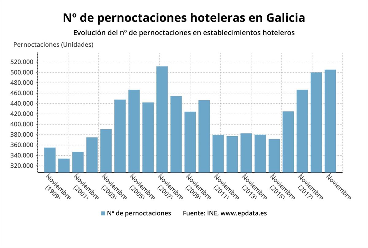 Los hoteles gallegos registraron un total de 505.406 pernoctaciones en noviembre, lo que supone un alza del 1% respecto al mismo mes de 2018, según los datos que publica este viernes el Instituto Nacional de Estadística (INE).