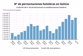 Los hoteles gallegos registraron 1.555.379 pernoctaciones en agosto en Galicia, lo que supone un 3,6% más que en el mismo mes de 2018, más del doble del avance medio en España (+1,5%), según los datos que publica este martes el Instituto Nacional de Estadística (INE).