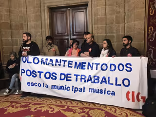 Representantes de CIG-Ensino y personal de la Escola Municipal de Música han mantenido este martes un breve encierro en el Pazo de Raxoi para reivindicar una solución a su situación laboral, después de que esta mañana se abriesen los sobres de contratación y de que la única empresa que concurrió al concurso "no incluyese la subrogación de los 24 trabajadores" que prestan servicio en este centro.