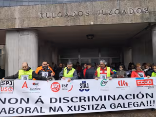 En Vigo, la manifestación ha partido a mediodía de la calle Lepanto hasta llegar a la Xunta, donde más de un centenar de personas se ha concentrado tras la pancarta 'Non á discriminación laboral na xustiza galega', y al grito de 'ni un paso atrás' y 'dignidad'.