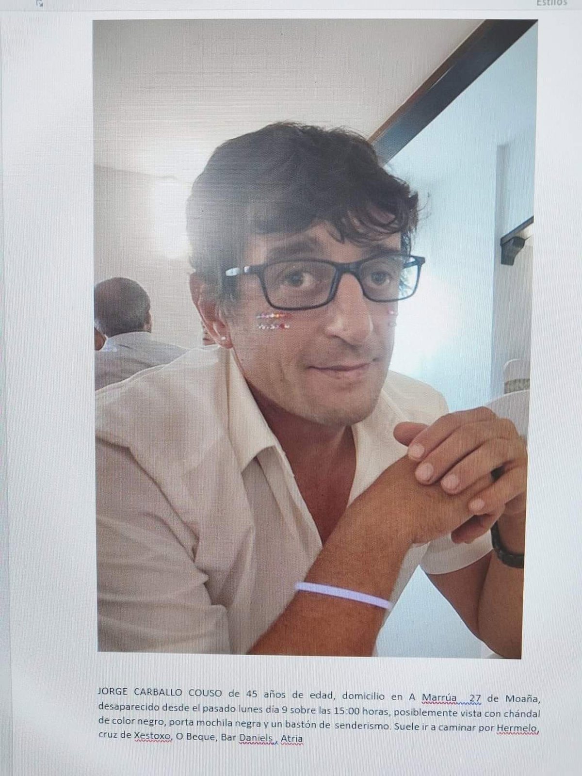 En concreto, se trata de Jorge Carballo Couso, de 45 años de edad, que salió para pasear de su domicilio, en el barrio de A Marrúa, sobre las 15,00 horas del lunes, pero no se sabe nada más de él. Según se informa, el hombre vestía, posiblemente, un chándal negro, mochila negra y bastón de senderismo.