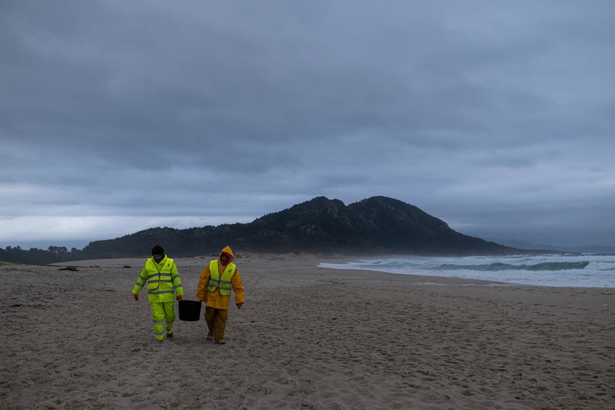 Dos hombres cargan un cubo lleno de pellets, en la playa Area Maior, a 13 de enero de 2024, en Muros, A Coruña, Galicia (España). La conocida ya como la marea blanca, se prevé que proceda de los seis contenedores del buque Toconao que cayeron al mar e - Elena Fernández - Europa Press
