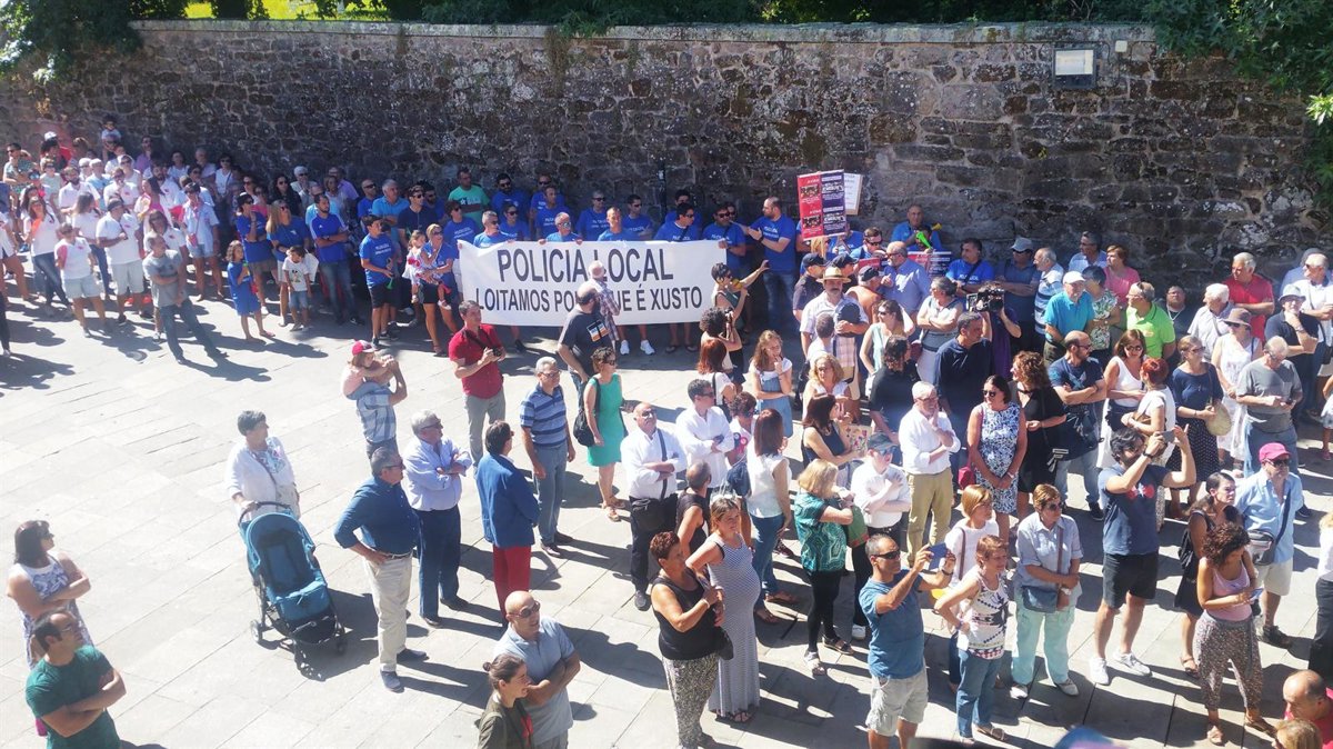 Una treintena de agentes de la Policía Local de Pontevedra, que reclaman su equiparación salarial con otros trabajadores municipales del mismo grupo, ha boicoteado el acto de inicio de las fiestas de la Peregrina en la Praza de Mugartegui, donde han hecho sonar bocinas y silbatos antes y después del pregón pronunciado por la periodista María Varela.
