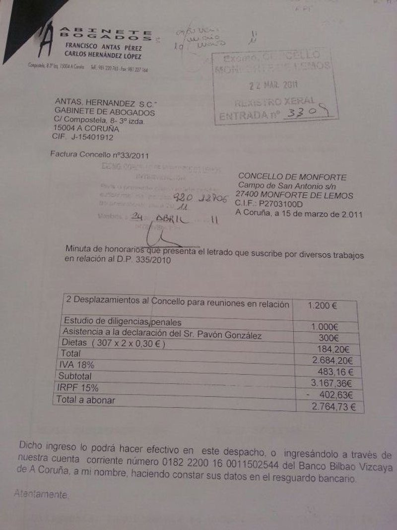 Al respecto, el PP ha hecho pública "una factura con fecha de 15 de marzo de 2011 por importe de 2.764 euros" en la que, según destaca, "se detalla que dicha asistencia legal corresponde al estudio de diligencias penales y asistencia a la declaración del señor Pavón González".