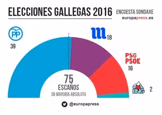 El PP obtendría 39 escaños, En Marea (partido en el que se integran Anova, Podemos y Esquerda Unida) lograría 18, al PSdeG le corresponderían 16 y el BNG únicamente tendría dos, según un informe de Sondaxe, que publica 'La Voz de Galicia'.