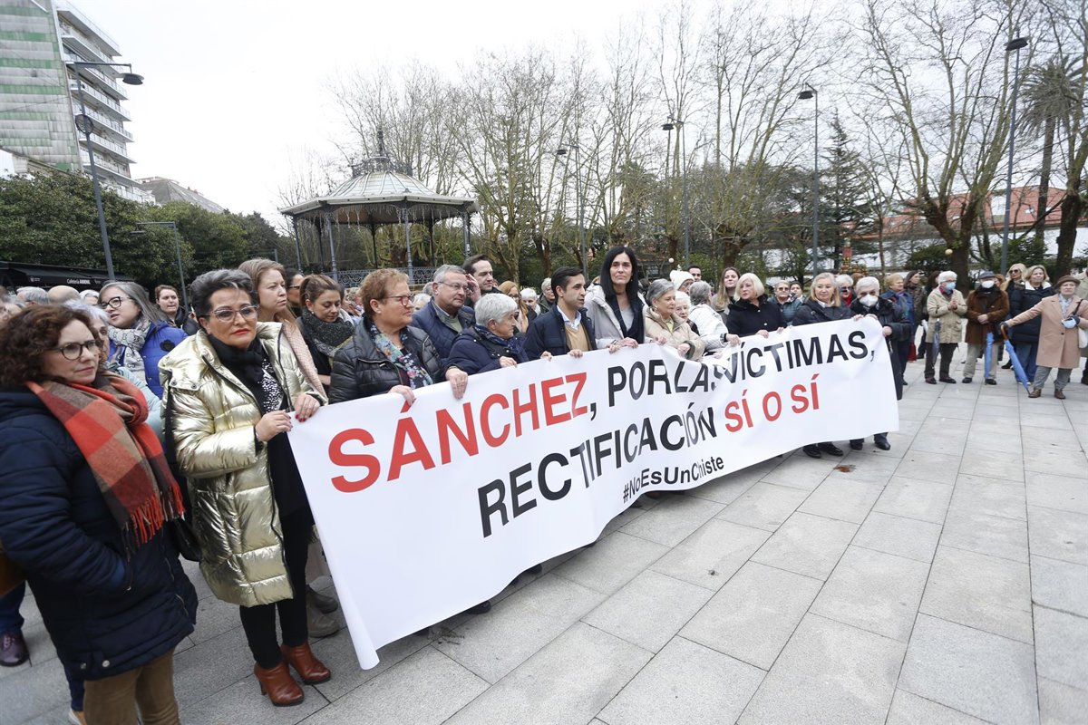 El presidente del PP de Ferrol, José Manuel Rey Varela (5i), y la secretaria general del PP gallego, Paula Prado (c), sujetan una pancarta que reza 'Sánchez, por las víctimas, rectificación sí o sí #NoEsUnChiste' durante la concentración convocada por e - Raúl Lomba - Europa Press