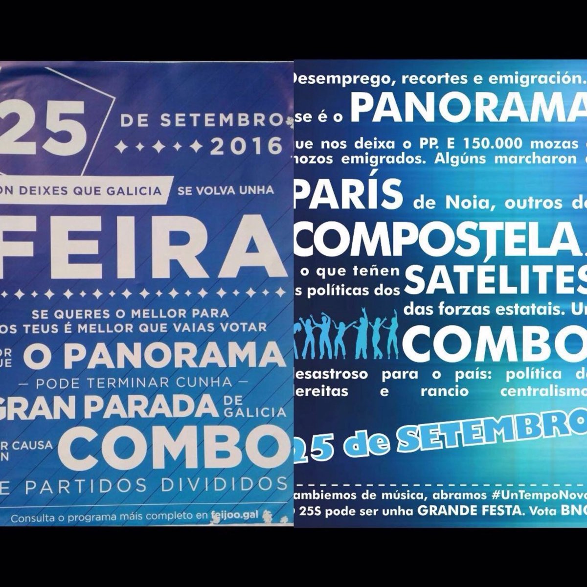 Fue el PPdeG el primero en dar el paso con un cartel en el que pide a los gallegos que el 25-S "no dejen que Galicia se vuelva una FEIRA (feria). "Si quieres lo mejor para los tuyos es mejor que vayas a votar porque el PANORAMA puede terminar con una GRAN PARADA de Galicia por causa de un COMBO de partidos divididos".