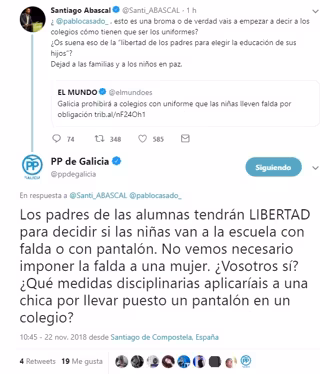 El PPdeG ha salido a defenderse en la red social Twitter de las críticas que el presidente de Vox, Santiago Abascal, ha hecho ante la iniciativa aprobada en el Parlamento de Galicia, a propuesta de En Marea, para que las niñas puedan escoger entre falda o pantalón cuando en el centro escolar sea obligatorio el uniforme.