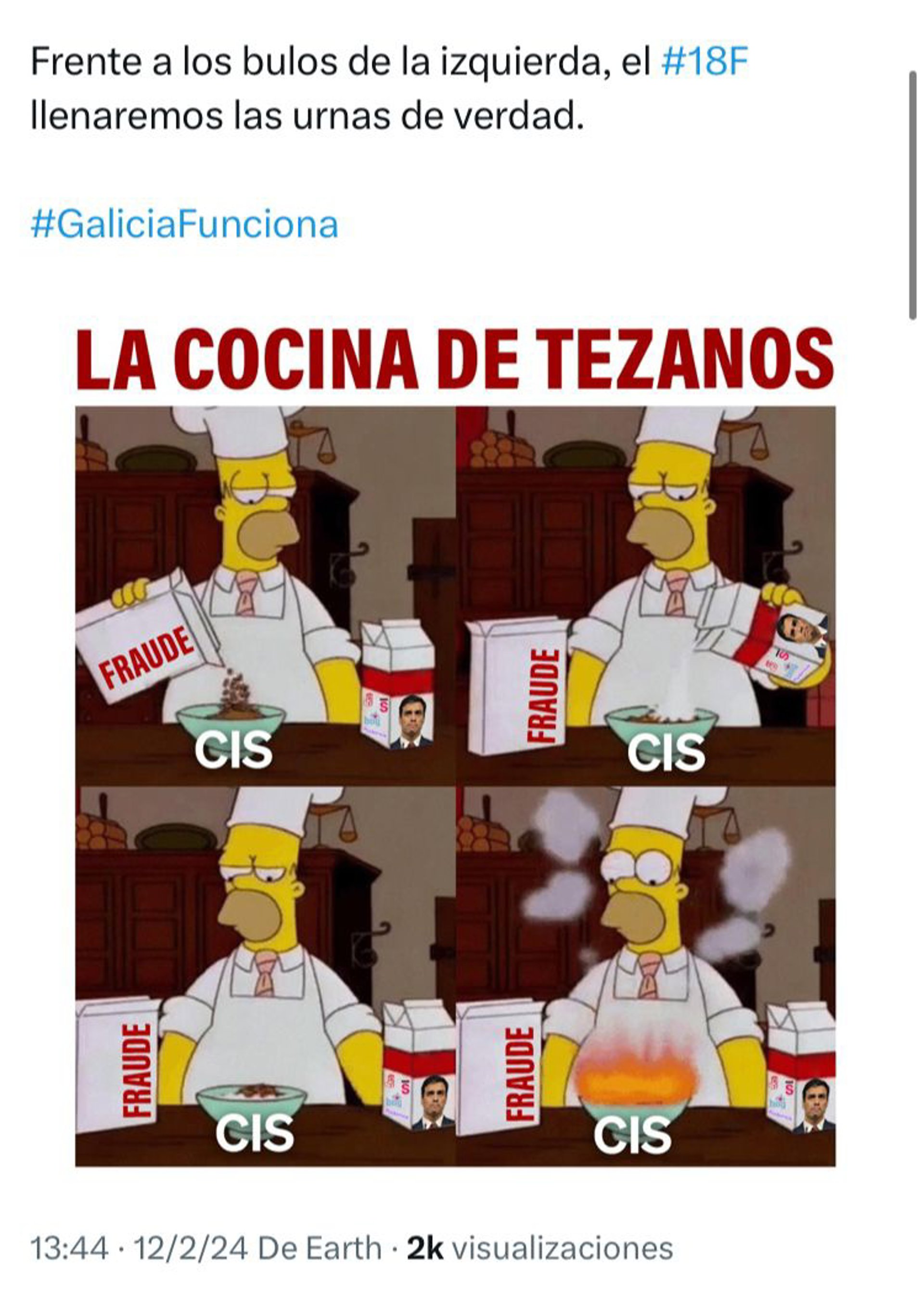 El PP gallego ha vuelto a recurrir a una escena de 'Los Simpson' --en concreto en la que se ve a Homer Simpson cocinando y con el lema "la cocina de Tezanos"-- para minimizar la relevancia de la última entrega de la encuesta preelectoral del Centro de Investigaciones Sociológicas (CIS), que reduce a un "fraude".