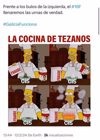 El PP de Galicia ha respondido a la encuesta a través de sus redes sociales. En su perfil de 'X' han colgado una imagen de la escena de Homer Simpson cocinando acompañada de un mensaje: "El CIS de Tezanos dice lo que Sánchez quiere que diga".