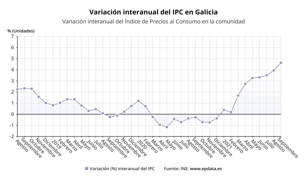 El Índice de Precios de Consumo (IPC) continúa con su escalada en septiembre en Galicia y aumenta un 4,6% en relación al mismo mes del año anterior, por encima de la media estatal (+4%), según los datos publicados este jueves por el Instituto Nacional de Estadística (INE).