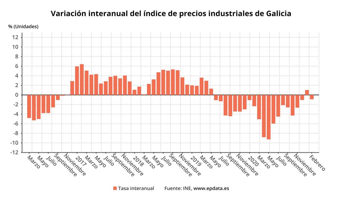 Los precios industriales registraron un descenso del 0,9% en febrero en Galicia en comparación con el mismo mes de 2020, según los datos que publica este jueves el Instituto Nacional de Estadística (INE).