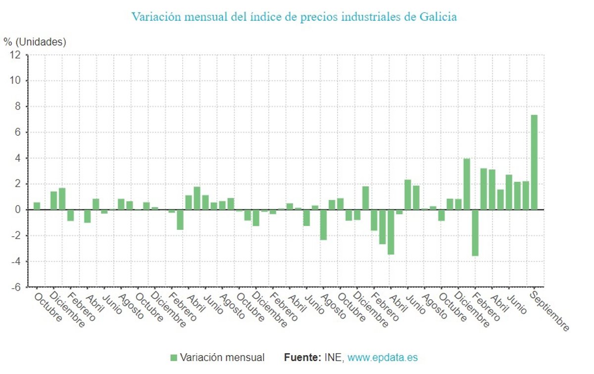 Los precios industriales subieron un 7,4% en septiembre en Galicia en relación con agosto, mientras que se dispararon un 25,8% en tasa interanual, por encima de la media.