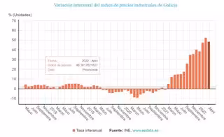 Con todo, el aumento de abril es inferior en cerca de cuatro puntos respecto al crecimiento por encima del 50% que experimentaron los precios industriales gallegos en marzo de forma interanual.