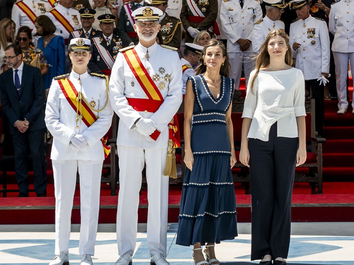 La Princesa Leonor; los Reyes Felipe VI y Letizia y la Infanta Sofía, durante la el juramento o promesa ante la Bandera y el acto de entrega de Reales Despachos y nombramientos a los nuevos oficiales de la Armada, en la Escuela Naval de Marín - BEATRIZ CISCAR / EUROPA PRESS