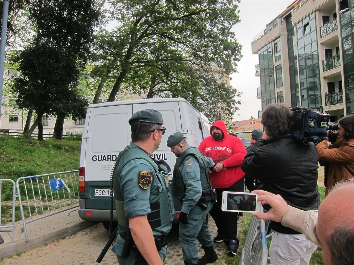 La mujer ha sido la primera en salir del edificio judicial, tras acordarse su puesta en libertad, y sobre las 14,50 horas lo ha hecho el hermano de Sinaí Giménez, en su caso esposado y escoltado por efectivos del Instituto Armado, que le introdujeron en el furgón para su traslado a la prisión de A Lama. Previamente, los agentes han metido en el furgón la caja fuerte incautada en la operación.