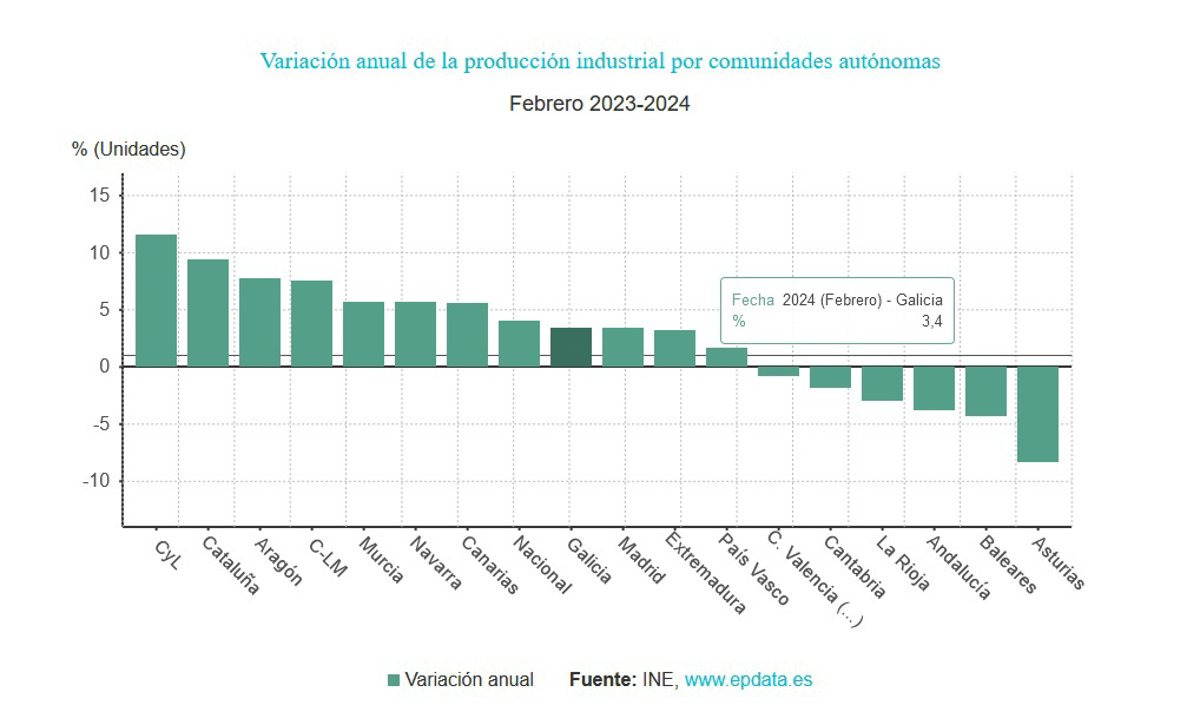 El Índice General de Producción Industrial (IPI) subió un 3,4% interanual en Galicia en febrero, por debajo de la media de avance del 4,1% en España, según datos publicados por el Instituto Nacional de Estadística (INE).