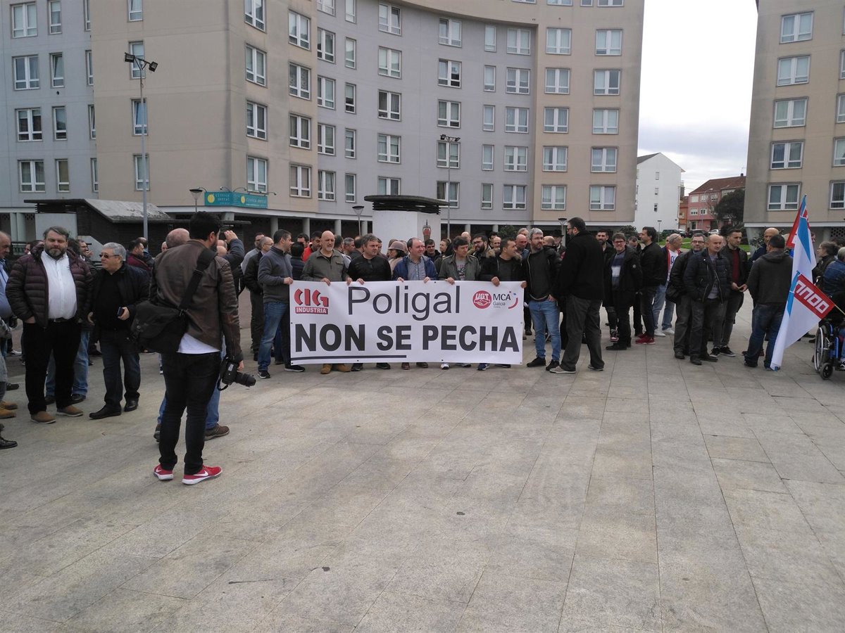 Con el lema 'Poligal no se cierra, cerca de 250 personas se han concentrado el mediodía de este sábado en la plaza de Galicia de Narón (A Coruña), para reclamar que no se clausuren las instalaciones de la empresa situadas en el polígono industrial de A Gándara, que cuenta con 108 trabajadores indefinidos, además de otros 5 con contrato temporales y personal de compañías, y que depende del grupo catalán Peralada.
