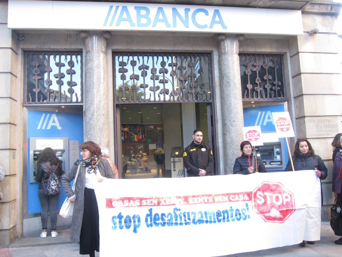 Unas 30 personas --convocados por Stop Desafiuzamentos-- se han concentrado este jueves ante una oficina de Abanca en Santiago para reclamar que no se desahucie a Mercedes, una señora de 82 años residente en Os Tilos (Teo), por una deuda bancaria.