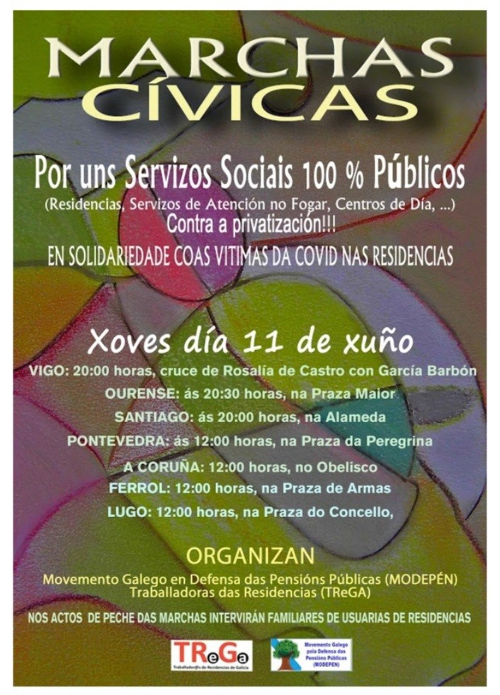 Pensionistas, trabajadores de residencias y familiares de usuarios han convocado el jueves día 11 de junio "marchas cívicas" en las siete ciudades gallegas para reclamar servicios públicos de calidad en las residencias de mayores y mostrar su solidaridad con las víctimas del coronavirus en estos espacios.