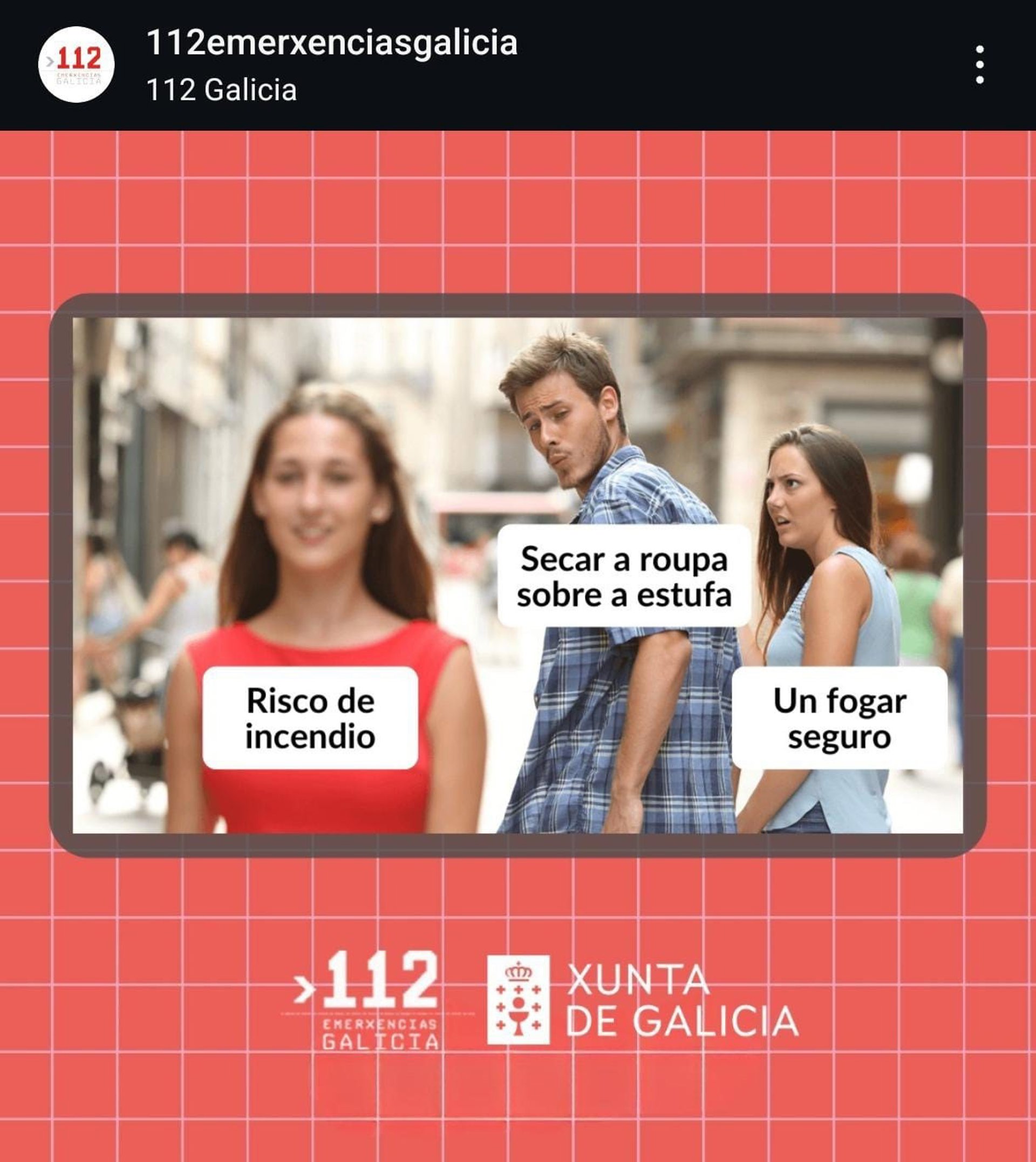 En concreto, hace dos días, la cuenta '112emerxenciasgalicia' publicó el meme del chico que va de la mano de su pareja y que se gira para ver a otra, con la intención de advertir de que secar la ropa sobre una estufa conlleva riesgo de incendio.
