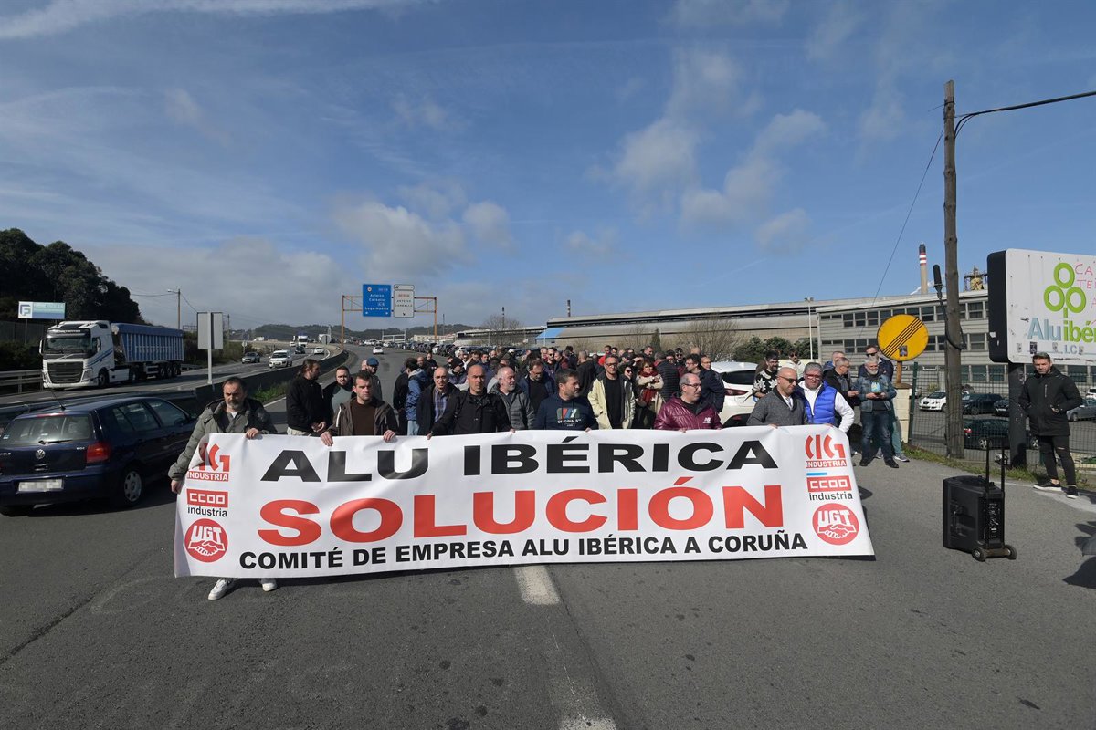 Un grupo de personas protesta con una pancarta durante una concentración frente a la fábrica de Alu Ibérica, a 14 de marzo de 2023, en A Coruña, Galicia (España). Al grito de Alu Ibérica, solución, los extrabajadores exigen el pago de sus indemnizacio - M. Dylan - Europa Press