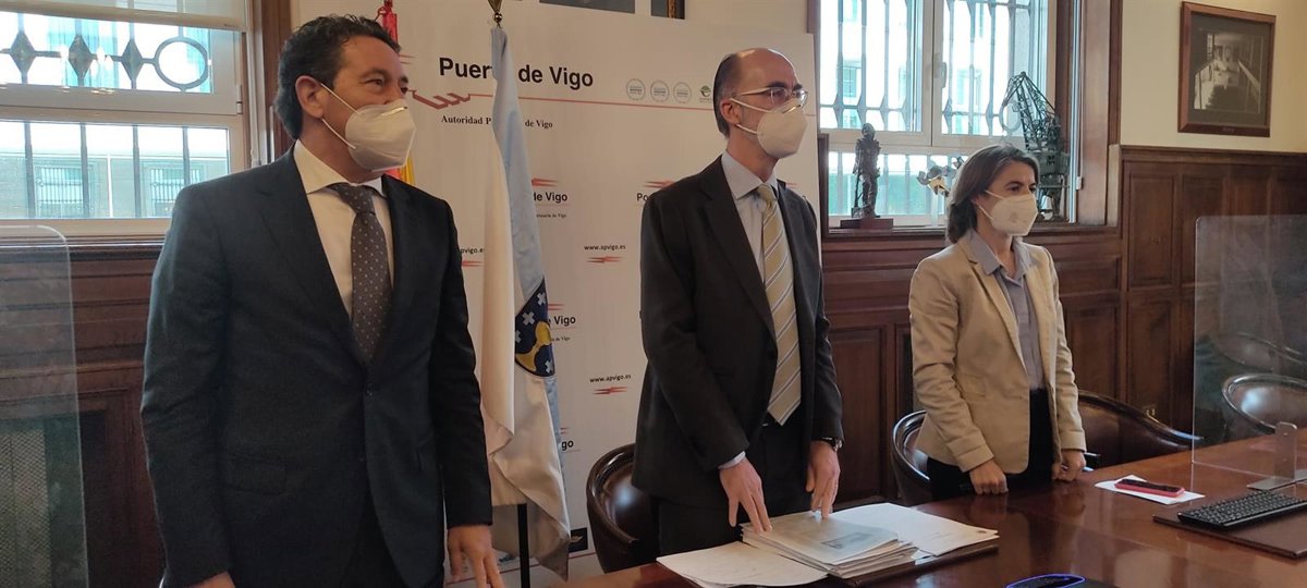 El presidente del Puerto de Vigo (c), Jesús Vázquez Almuíña, junto al secretario del organismo, José Ramón Costas, y a la directora del mismo, Beatriz Colunga. - AUTORIDAD PORTUARIA DE VIGO