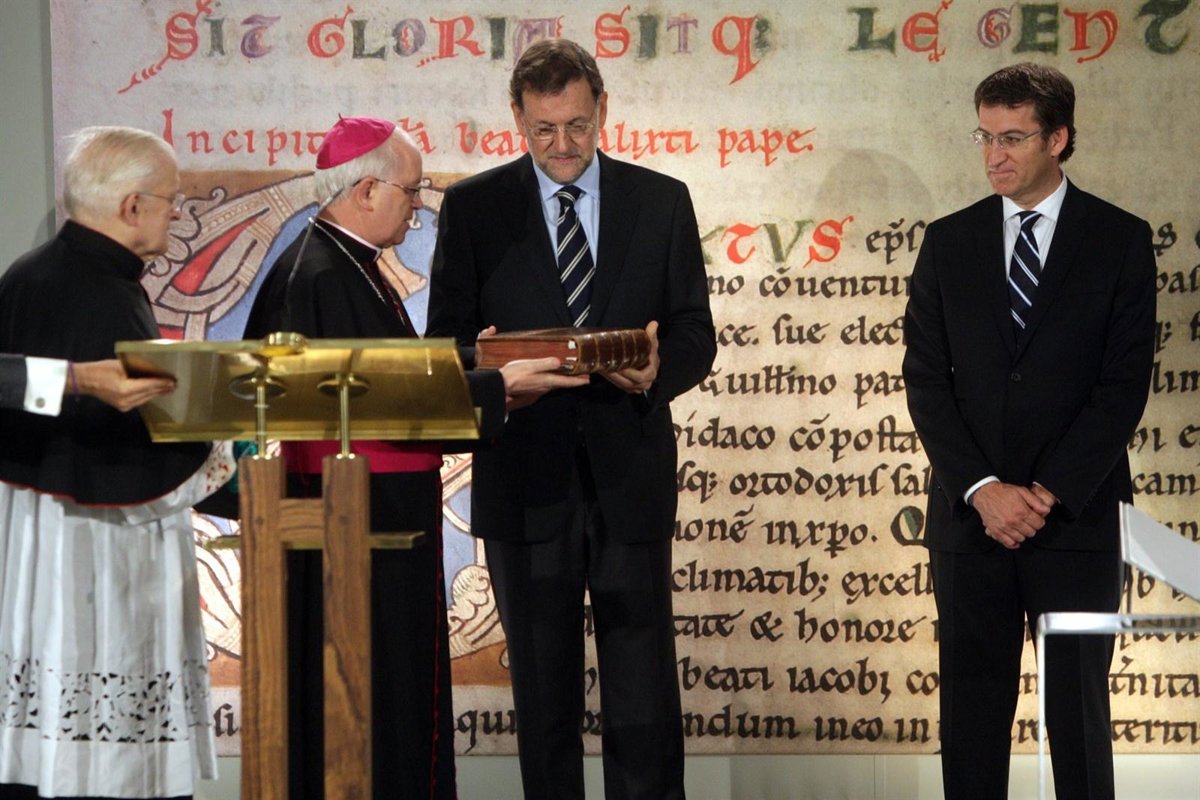 En el acto de devolución del Codex Calixtinus al templo compostelano, Mariano Rajoy ha realizado la entrega simbólica de esta pieza de valor incalculable, en un evento en el que también han intervenido el presidente de la Xunta, Alberto Núñez Feijóo; y el arzobispo de Santiago, Julián Barrio.