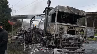 Estado en el que ha quedado un camión que transportaba mercancías peligrosas y que ardió en la A-6, a 24 de febrero de 2023, en Betanzos, A Coruña, Galicia (España). - M. Dylan - Europa Press