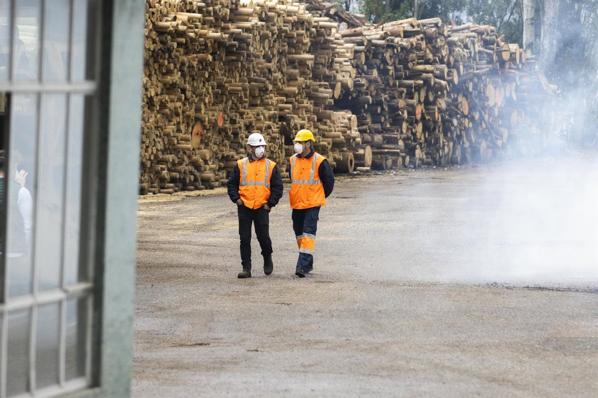 Dos vigilantes caminan por la antigua fábrica de Pontesa, a 7 de noviembre de 2022, en Ponte Sampaio, Pontevedra, Galicia (España). El incendio se desató ayer domingo 6 de noviembre en las instalaciones empleadas por el Grupo Nogar para el almacenamient - Beatriz Ciscar - Europa Press