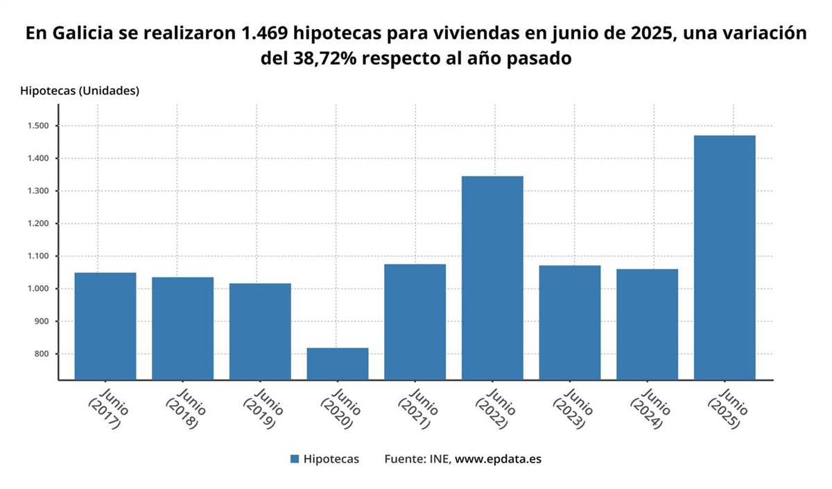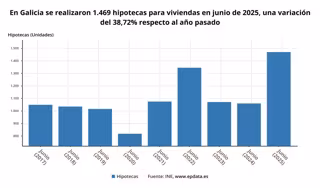Los registros de la propiedad de Galicia inscribieron en el mes de junio de este año 1.469 hipotecas sobre viviendas, por valor de unos 185 millones de euros, de un total de 2.040 hipotecas formalizadas. Las hipotecas sobre viviendas descendieron un 17,8 % respecto al mes de mayo, pero aumentaron un 32,4 % respecto a junio del año pasado.