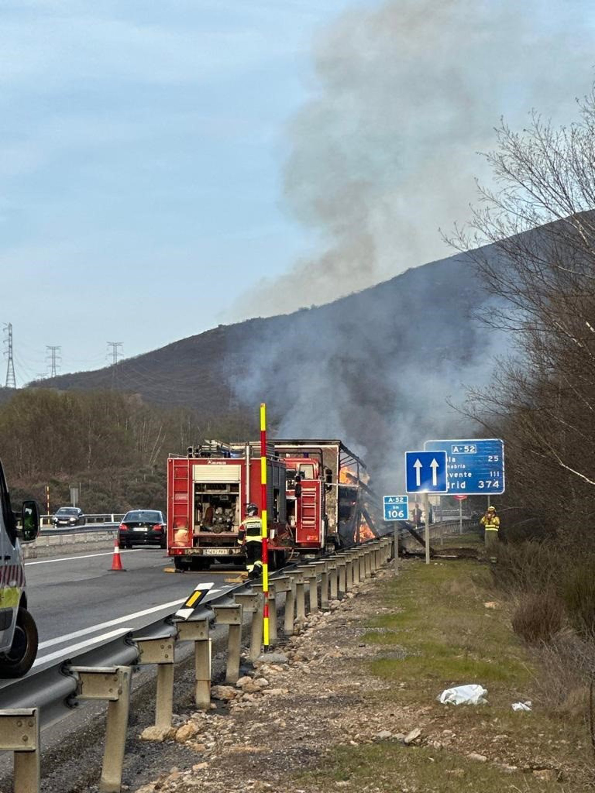 El tráfico en la autovía A-52, en sentido Benavente, ha quedado restablecido tras el corte registrado en las últimas horas debido al incendio de un camión cargado con madera, en Lubián (Zamora).