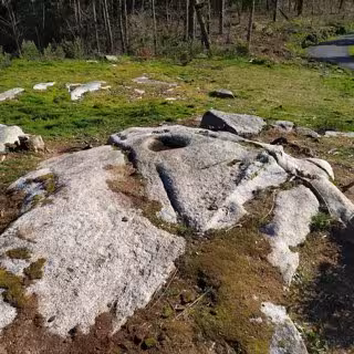 Varios miembros del colectivo A Rula halló en esta piedra unos grabados sin catalogar, muy erosionados pero visibles a plena luz del día, sobre los que el Ayuntamiento de Noia había instalado el mencionado banco.