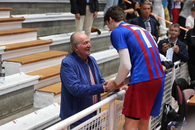 En ese mismo momento, Pablo Urdangarín se estaba sacando 'selfies' con varios niños que se le acercaban y, acto seguido, ha acudido al punto donde estaba su abuelo para abrazarlo durante unos segundos. Ambos se han intercambiado algunas frases al oído e, incluso, el jugador del Barça B le ha besado la mano.