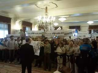 Los manifestantes, subidos a las mesas y a los bancos para el público, recibieron a los miembros del gobierno local del PP con gritos de "dimisión", "corruptos", "sinvergüenzas" y cánticos de 'Dónde están las promesas del PP', 'Fuera delincuentes de las instituciones' y 'El pueblo unido jamás será vencido', aunque los mayores abucheos los recibió el alcalde, al que acusaron de "mentiroso".