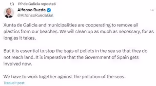 Tras ello, en un mensaje publicado en inglés, Rueda traslada que la Xunta y los ayuntamientos colaboran para eliminar todos los plásticos de las playas y que limpiarán todo lo que sea necesario, durante el tiempo que sea necesario.