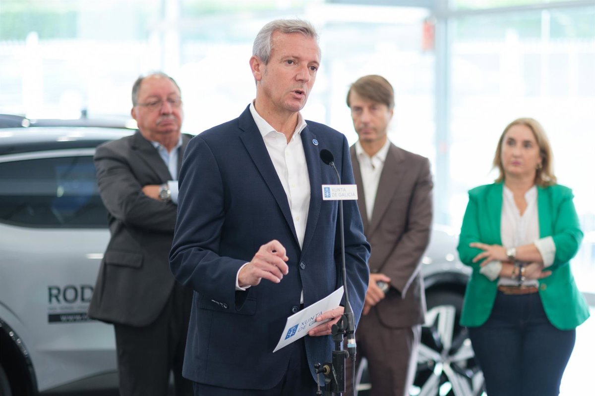 El presidente de la Xunta, Alfonso Rueda, en un acto en un concesionario de vehículos en Nigrán (Pontevedra), a 3 de octubre de 2023. - DAVID CABEZON @ XUNTA