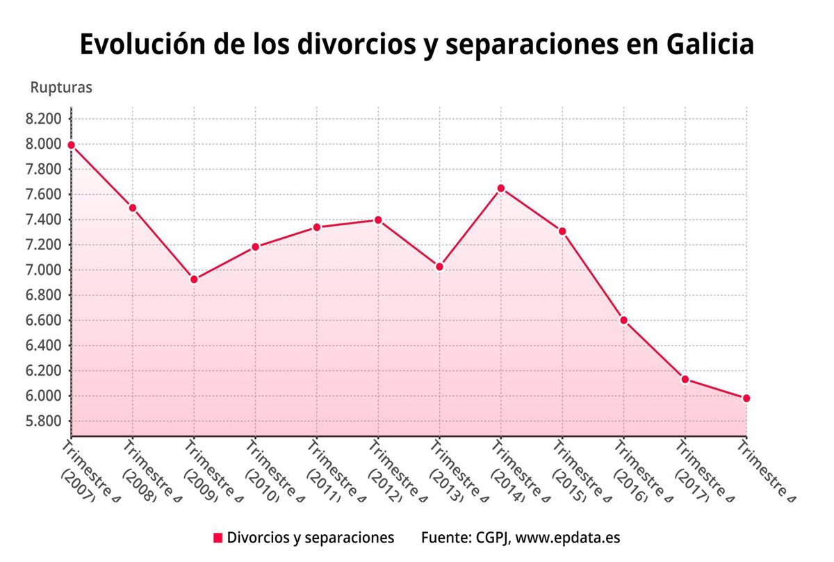 Si se tienen en cuenta las cifras de población a 1 de enero de 2018, Galicia se sitúa en 22,1 peticiones de ruptura matrimonial por cada 10.000 habitantes, por debajo de la media estatal, que es de 23,9.