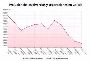 Durante el año pasado se presentaron en Galicia 5.981 demandas de ruptura matrimonial --separaciones y divorcios--, frente a las 6.132 de un año antes, lo que supone un descenso del 2,5%.