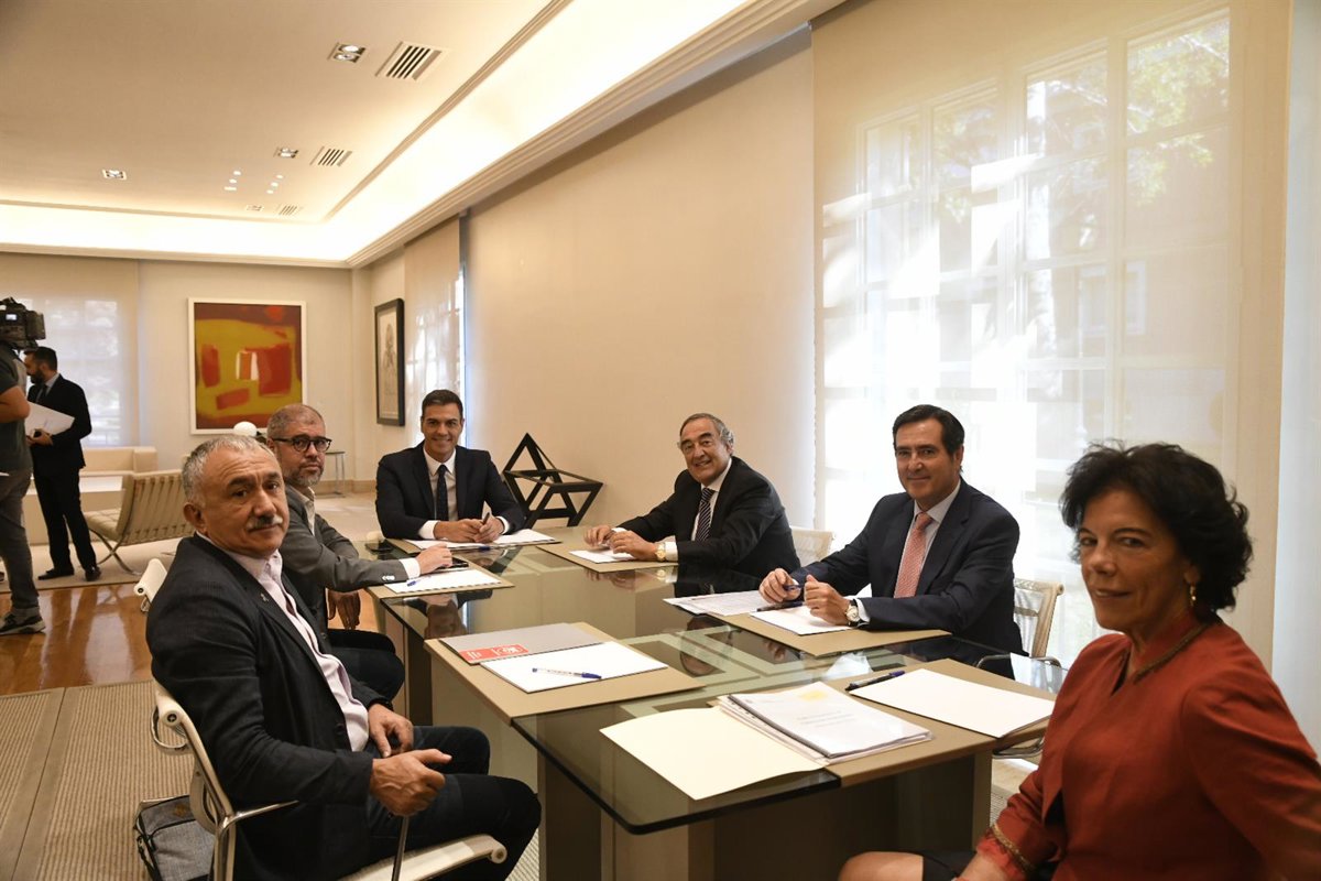 El presidente de la CEOE, Juan Rosell, y los secretarios generales de CC.OO. y UGT, Unai Sordo y Pepe Álvarez, se han reunido este lunes en Moncloa con Sánchez y con la ministra de Educación, Isabel Celaá, para conocer el plan estratégico para la Formación Profesional, reunión que han aprovechado para preguntar al Ejecutivo por este tema.